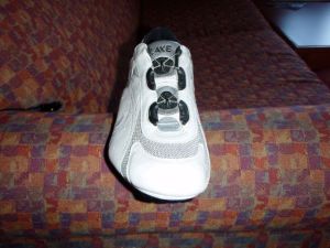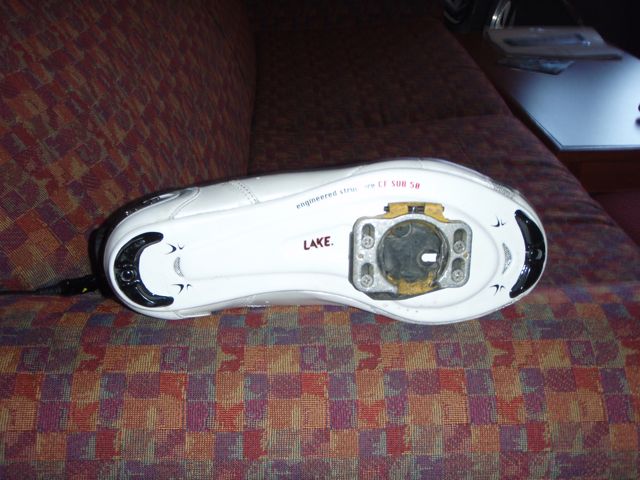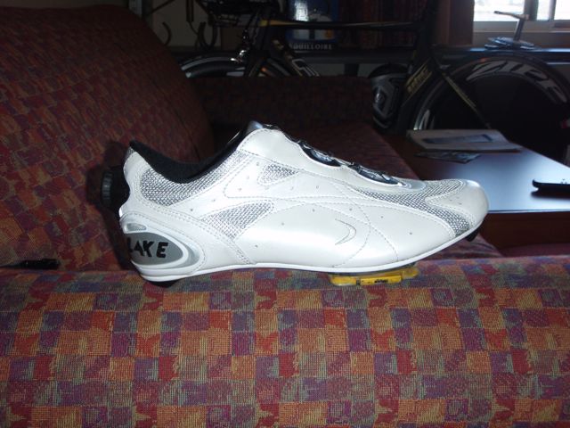 Many thanks to Alana Stewart and the folks at Lake. These are the most comfortable shoes I’ve worn, out of the box. The upper is a mix of synthetics and kangaroo leather (just like a good pair of soccer cleats). They lace up with the BOA lacing system, which uses a stainless steel wire (very fine) instead of velcro or ratchet straps. The reel is located on the heel, which pulls your foot back into the heel cup. It’s very nice. I’ve only got a couple rides on them, but I’m very pleased. I’ll check back once I’ve got some more time in the saddle with these dogs under my feet.